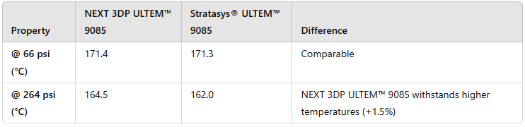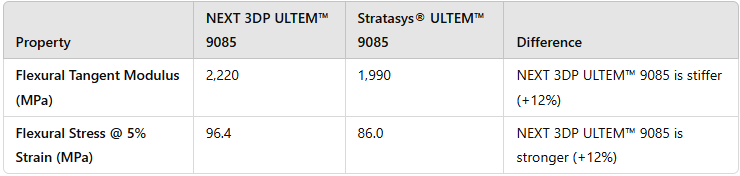 NEXT 3DP ULTEM™ 9085 measured slightly stiffer, which may benefit applications needing added rigidity.