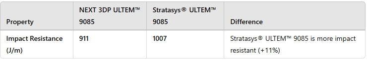 NEXT 3DP 9085 vs. Stratasys ULTEM™ 9085 Test Results
