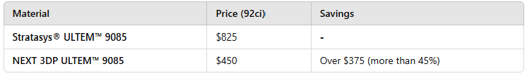 NEXT 3DP ULTEM™ 9085 offers significant cost savings, priced at nearly half the cost of Stratasys® ULTEM™ 9085 — making it the smarter, budget-friendly choice without sacrificing performance.