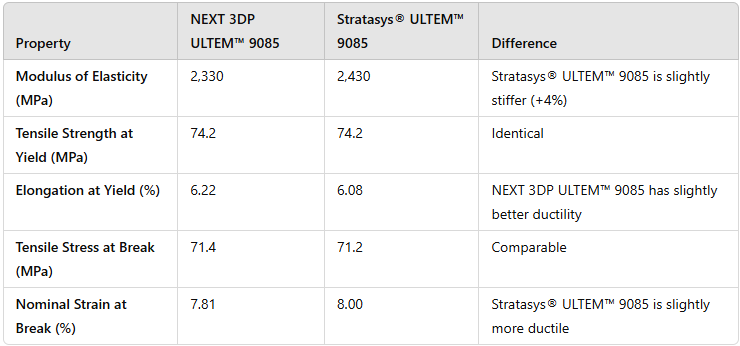 NEXT 3DP ULTEM™ 9085 and Stratasys® ULTEM™ 9085 show remarkably similar mechanical properties, with only small differences between the two materials.